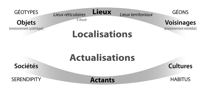 Face au triptyque gradué cultures/actants/sociétés, il est maintenant aisé de concevoir son pendant : voisinages/lieux/objets. Les voisinages – autrement dit l’environnement immédiat, littéralement : sans intermédiation – constituent, pour l’intelligence des situations spatiales, un horizon d’agrégation maximal des lieux entrant en ligne de compte dans un problème pour en composer l’espace. Cet horizon donne un statut analytique à l’indifférenciation, permettant du même coup la définition et la sélection d’un nombre limité de lieux pertinents, et d’un « reste » spatial prenant en charge les relations implicites. À l’opposé, la discrétisation maximale de l’espace conduit à la définition des objets, médiateurs composant un environnement systémique, qui n’ont de dimension spatiale que leur localisation absolue dans une grille abstraite. Là encore, ces deux extrêmes ne sont que des abstractions tendancielles, qui chargent tout raisonnement spatial d’une dose de facteurs implicites, de relations informelles, globales, non dénombrables.