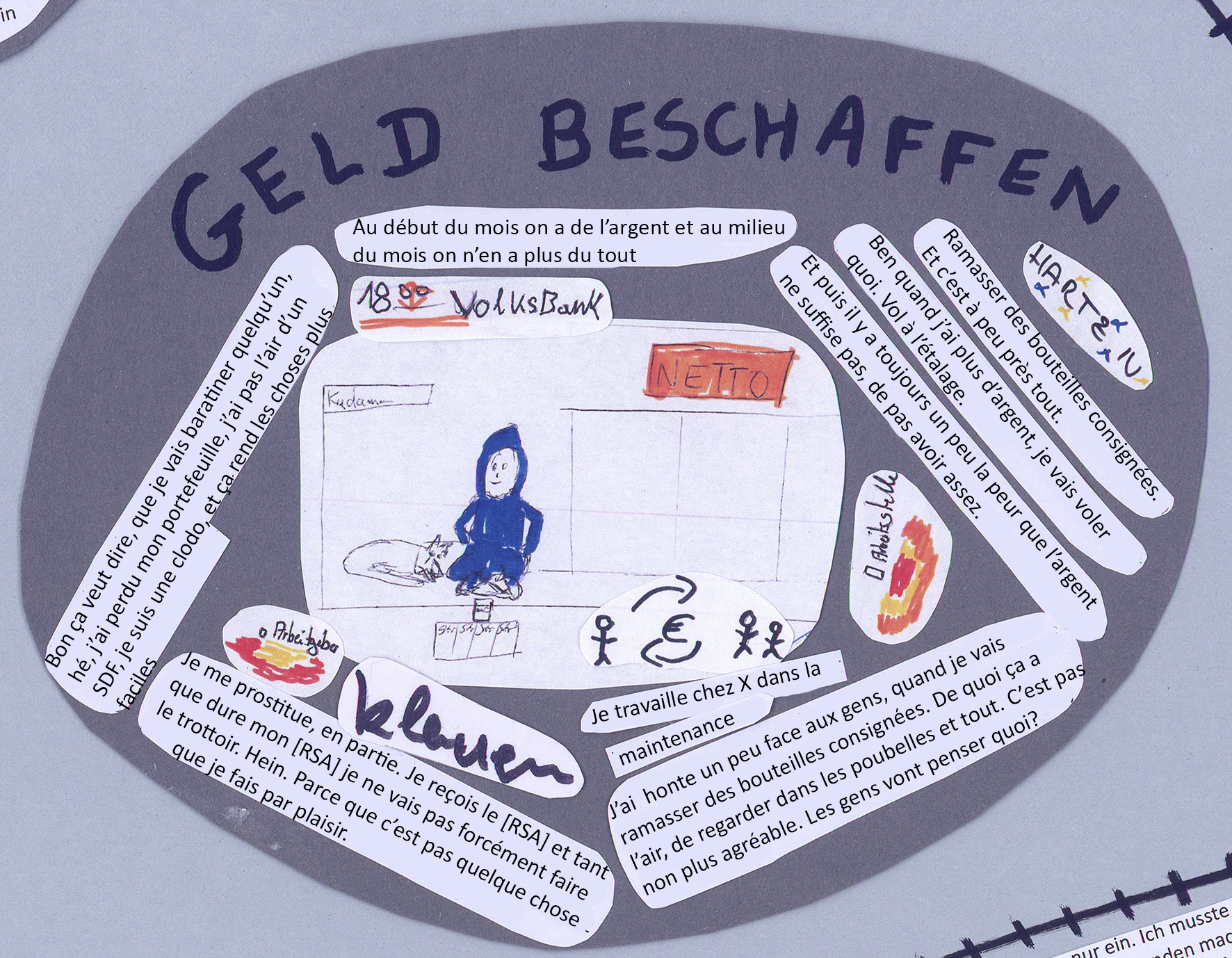 Même pour les personnes qui reçoivent un RSA ou son équivalent Harz IV, la recherche d’argent nécessaire pour pouvoir acheter les substances à consommer façonne l’espace de vie des participant·es, prend du temps et structure des relations avec les autres. Quelle que soit la forme que prend la recherche d’argent, elle repose sur le choix d’activités, lieux et horaires qui marchent bien : travail saisonnier, en intérim, à la journée, travail du sexe, vol à l’étalage, deal (Beauchez 2017), revente de ses traitements, ramassage des bouteilles consignées (à Berlin) ou mendicité. Les contraintes et la discipline qu’impliquent ces activités, même lorsqu’elles sont non reconnues ou illégales, nous amènent à considérer qu’il s’agit d’un véritable travail.