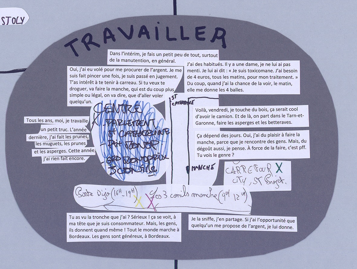 L’analyse des résultats alterne explorations individuelles du matériau et constitution d’une grille d’analyse commune, identifie une dizaine de thématiques centrales pour toutes les villes et établit les principes de reconstitution de la topographie de chaque ville à partir de la toponymie (Germes et Klaus, à paraître). Elle est restituée sous la forme de collage d’extraits des cartes et de citations des transcriptions des entretiens anonymisés. La technique du collage rend compte d’un nombre important de citations, ordonnées par thème selon l’analyse de l’ensemble des entretiens menés dans le projet. Le collage, certes ordonné et scénarisé par les copiés/collés des chercheures, est un intermédiaire minimal qui livre un aperçu divers, intime et complexe, (ré)interprétable à chaque lecture, des façons dont dans ces deux villes les usager·ères de drogue marginalisé·es habitent.