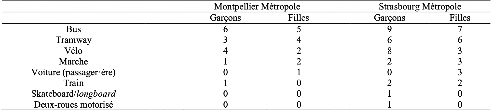 [12]. Près de quatre filles sur dix contre près d’un garçon sur dix n’avaient pas pratiqué le vélo de manière répétée durant les douze mois précédant l’enquête. Le vélo constitue le mode de déplacement principal de 27,9 % des garçons et de 12,8 % des filles. Bien que les communes de Montpellier et de Strasbourg soient équipées de systèmes de vélos en libre-service, seul un adolescent de l’échantillon a déclaré y recourir régulièrement : notamment en raison de conditions de location peu adaptées aux personnes mineures (carte bancaire, dépôt de garantie, etc.).