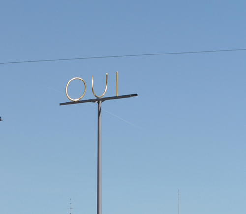 De quelle sorte de frontière s’agit-il ? En fait, l’espace public du débat qui nous a obsédé s’inspire d’une sorte de savant mélange entre un Horizont, et un No man’s land, dans un contexte très urbain, et donc a priori propice à l’expression de l’attachement à l’échelle multiple qui sied si bien à l’Europe réelle. En effet, c’est un espace d’échange à l’allure d’un Horizont, car cette sculpture est une métaphore qui illustre, par l’entremêlement des fils de fer et des mots qui se forment au gré de la balade, les confins de l’urbanité du dialogue démocratique. Ainsi, grâce à la portée du doublet oui/non qui se métamorphose au fur et à mesure que l’on se déplace d’est en ouest le long de la façade sud de la place, il crée une frontière idéologique mouvante par-delà les limites physiques de la place elle-même.