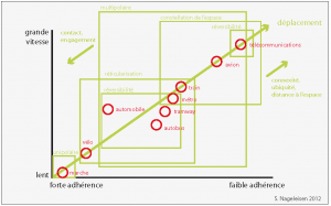 Le déplacement d’un point A à un point B se fera donc différemment en train, en voiture sur une autoroute ou sur une départementale, en vélo ou à pied : vues latérales et lointaines, vues frontales sans relation avec les alentours, vues multiples (Nageleisen 2007)[18]. Il est donc possible d’affirmer qu’« une technique de transport impose au voyageur des façons de faire, de sentir, de se repérer […] Qu’elle modèle une approche originale de l’espace traversé, que chaque grande technique porte en soi un “paysage” » (Desportes 2005).
