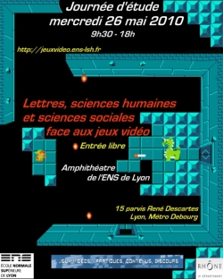 Pour apporter des éléments de réponse à ces questions théoriques et épistémologiques, le laboratoire junior « Jeux vidéo : pratiques, contenus, discours » organise sa seconde journée d’études le mercredi 26 mai 2010 (à l’amphithéâtre du site Descartes), sur le thème « Les lettres et les sciences humaines et sociales face aux jeux vidéo ». Jeunes chercheurs et chercheurs confirmés, spécialistes de jeux vidéo ou non, sont invités à réfléchir ensemble sur la manière dont les jeux vidéo interpellent leurs disciplines respectives. L’étude des jeux vidéo montre une tension entre la nécessité d’approches ancrées disciplinairement et l’objectif de cerner les jeux vidéo dans toute leur spécificité.