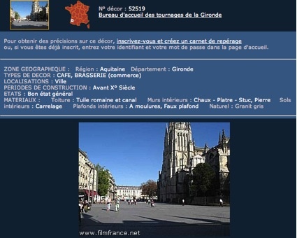 Ces films agissent comme des actions de marketing territorial (c’est pour cela d’ailleurs que la région intervient). L’Aquitaine et Bordeaux sont « à vendre » et, qui plus est, à vendre sur catalogue, comme le montre le carnet de repérage produit par Aquitaine Image Cinéma (2005). Il recense une bonne partie des rues, des places et édifices prestigieux de la ville de Bordeaux, selon des catégories préétablies, mais aussi un large panorama des paysages aquitains : le littoral, la forêt de pins, le vignoble, les bastides de l’Agenais, les châteaux du Périgord, etc. Chaque fiche du carnet présente une photo des différents lieux et un texte qui fait largement appel à l’imaginaire. Le carnet permet de juger la qualité du bâti, de l’ambiance des portions de ville choisies, des couleurs dominantes de la nature, et facilite ainsi le repérage nécessaire pour préparer les tournages. Dans ce carnet, la vie est absente, ce qui le différencie considérablement d’autres plaquettes de communication ; les planches sont en quelque sorte détachées de la réalité, elles mettent en place une esthétique abstraite qui obéit à la logique d’une séquence cinématographique. Le paysage y est présenté comme un acteur à part entière du film, dont le carnet ferait le casting. Nous sommes bien dans une logique d’artialisation in visu. Une partie de ces décors est visible en ligne sur le site de Film France (Image 4). Autant de lieux et de matières, pages vierges sur lesquelles le cinéaste va insérer sa fiction et transformer, par son regard d’artiste, le pays en paysage.