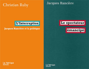 « La politique ne peut exister que dans un acte d’interruption, de dérèglement ou d’effraction, » écrit Christian Ruby dans son introduction au travail de Jacques Rancière, L’interruption (Paris, Fabrique, 2009). L’auteur poursuivra sa réflexion sur les écrits de Rancière lors d’une intervention à Paris V Sorbonne le 11 février prochain de 18h à 20h […]To refer to this post (ISO 690)