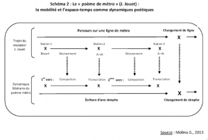 Un des premiers ressorts de l’écriture jouetienne consiste à se saisir de l’expérience immédiate que l’auteur fait d’un lieu. La pratique spatiale génère ainsi une dynamique littéraire spécifique, un ensemble de contraintes et de ressources que l’Oulipien utilise pour écrire. Si la plupart de ses expériences s’inscrivent dans cette perspective, c’est peut-être le « poème de métro » qui constitue la forme la plus emblématique de ce nouveau mode de fabrique littéraire du point de vue du rapport au temps et à l’espace qu’il engage. Mais avant d’analyser plus amplement le dispositif mis en jeu par le poème métro, laissons l’auteur nous en donner sa définition :