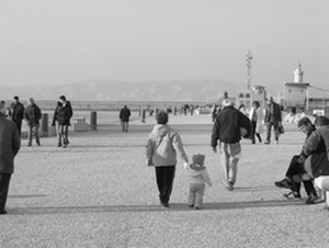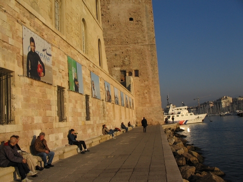 À l’entrée du vieux port de Marseille, le projet Euroméditerranée prévoit la construction d’un musée, le Musée des Civilisations de l’Europe et de la Méditerranée (Mucem). Il accueillera les anciennes collections du Musée National des Arts et Traditions Populaires (Mnatp) que les badauds en promenade au jardin d’acclimatation croisaient sans le savoir. Un concours d’architecture a été lancé, remporté par un architecte de la région, Rudy Riccioti. Son projet prévoit l’installation d’un cube d’acier et de verre de couleur blanche, dans le prolongement d’un quai du port de la Joliette (J4), au pied du fort Saint-Jean. Une darse doit être creusée entre l’ancien et le moderne, une passerelle aérienne jetée entre les deux, symbolisant quelque chose au yeux de leurs concepteurs, mais quoi ? Pour l’heure, le projet démarre poussivement. La tour du fort Saint-Jean a été aménagée pour pouvoir accueillir des expositions du Mnatp. En décembre 2006, une banderole malingre annonce un programme à faire chavirer les âmes sensibles : « Rêver Noël : Faire la crèche en Europe ». Mais la principale attraction du quartier, ce ne sont pas les escaliers en colimaçon de la tour qui conduisent à cette exposition, mais davantage la promenade qui débute à l’entrée de la tour et se poursuit jusqu’au bout de la digue, où s’ouvre une vue panoramique sur l’entrée du port autonome, le palais du Pharo et les îles du Frioul. Par tout temps, les gens viennent ici se promener, pique-niquer, pêcher, flâner. Qui sont ces gens ? Le musée a voulu rendre compte à sa manière de la fréquentation de cette promenade que l’on pourrait qualifier de « populaire ». Peut-être s’est-il rendu compte qu’il s’agissait là d’un aspect de la culture méditerranéenne, sans s’avouer qu’elle serait menacée par l’existence même du projet architectural. Car de cette promenade, il ne reste rien dans le coup de crayon de Rudy Riccioti, à l’exception de la passerelle, dont l’accès, on l’imagine facilement, sera réglementé : interdiction de pêcher, de s’asseoir, de manger, de jouer, de faire du roller, de s’embrasser…1 L’architecte y est à la fois pour quelque chose, et n’y peut pas grand-chose, lui qui aime à décrire la géographie urbaine marseillaise vue d’en haut, à coup de feutre sur une feuille, traçant des lignes et des pans de la ville comme Dieu aimerait parfois se bourrer une bonne pipe. On ne peut pas demander ce que la promenade signifie aux hommes de culture rapide, de lettres vides, aux élus et aux chercheurs studieux, pas plus qu’aux architectes. Dans ce projet de musée voué à la culture, l’échelle du piéton disparaît d’un trait de gomme, et avec lui, l’une des promenades les plus belles de l’hyper centre de Marseille. L’institution muséale actuelle, fébrilement nomade entre la capitale et le Sud, a dû s’en rendre compte et être saisie par une forme de culpabilité : elle a demandé qu’on montre ces gens, qu’on en parle, bref, que l’on expose ce qui va disparaître. Dans un réflexe peut-être ultime, souhaitant sans doute se garder de toute dérive folkloriste, elle a accroché, comme cela se pratique sur les grilles du Luxembourg, des photos grands formats, harnachées par des cordages voyants, d’un grain qui laisse plutôt à désirer. Elles figurent une galerie de portraits. On est censé y reconnaître le petit peuple de Marseille, qui aime sa promenade, où il trouve les joies simples des saines distractions : la pêche, etc. Tout le monde le sait, surtout ceux qui voient Marseille de loin, les habitants sont mélangés, « métissé » (vocable honni mais qui revient parfois comme une scorie des années 1980), bref, ces portraits expriment le désir naïf de rendre compte de cette population « multiculturelle ». On y voit beaucoup de marseillais d’origine étrangère, et si le spectateur ne comprenait pas bien, la photo du minot genre bon ptit Beur, avec derrière lui le « Algerie » de la société Algerie Ferries, vient enfoncer le clou. Au milieu de ces portraits, minoritaires, deux photos de marseillais « d’origine française ». Ces catégories taillées à la serpe transpirent du traitement des faciès : le promeneur doit bien comprendre que d’un côté, on a un petit peuple dont le berceau d’origine est la Grèce, les Balkans ou le Maghreb, et de l’autre un même petit peuple, dont les traits du visage tirent davantage vers l’Européen des pays d’Europe occidentale. Ces derniers, tout comme les premiers, relèvent de la fresque pagnolesque : lui a le crâne rasé et l’air bonhomme, elle a la peau du visage ridée comme seules « les vieilles peaux » qui s’abrutissent au soleil l’obtiennent dès la quarantaine. Certaines femmes des quartiers sud, celles qui appartiennent à la bourgeoisie marseillaise des beaux quartiers, doivent bien rire, elles qui ont appris jeunes que le soleil abîmait la peau. Étrangement, les auteurs de l’exposition n’ont pas daigné leur tirer le portrait. Serait-ce parce qu’elles sont davantage coutumières de la régate en voilier ? Et qu’elles voient la promenade du petit peuple depuis le pont d’un dix mètres ? Résumons, ces portraits présentent des marseillais de souche qui peuvent distinctement être référés à une origine ethnique, de façon à ce que le message soit bien clair : les promeneurs sont d’authentiques marseillais, mélangés etc. Et surtout, ils sont socialement homogènes, c’est-à-dire plutôt débraillés, mal sapés, en short et tongues : des plagistes sympathiques, parce que pas méchants, conformes aux représentations du Sud folklorisé2. Cette exposition ne se limite qu’à un seul aspect de la population des promeneurs du fort Saint-Jean et de la digue. Elle évacue tous ceux, de classe moyenne et supérieure, qui se rendent aussi dans ce lieu pour y prendre l’air. N