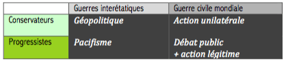 Le tableau (Figure 3) classe les attitudes face aux conflits contemporains. L’un des traits habituels de l’extrême gauche européenne est son refus de considérer l’idée que les enjeux de violence supranationale puissent être politiques et non géopolitiques, et de toujours prôner un non-interventionnisme qui peut aussi être vu comme un refus d’aider les porteurs locaux de valeurs progressistes. De son côté, le néoconservatisme américain a montré sa faiblesse en prétendant s’appuyer sur des valeurs, mais sans se soucier que celles-ci soient partagées par les « bénéficiaires » de son action. Il n’est pas toujours facile de distinguer les deux lignes de la colonne de droite. Ainsi, l’intervention de l’ONU en Libye en 2011 ne peut vraiment rester dans la case en bas à droite du tableau qu’à condition d’associer écoute des acteurs et action légitime durable, ce qui ne semble pas avoir été le cas depuis lors.