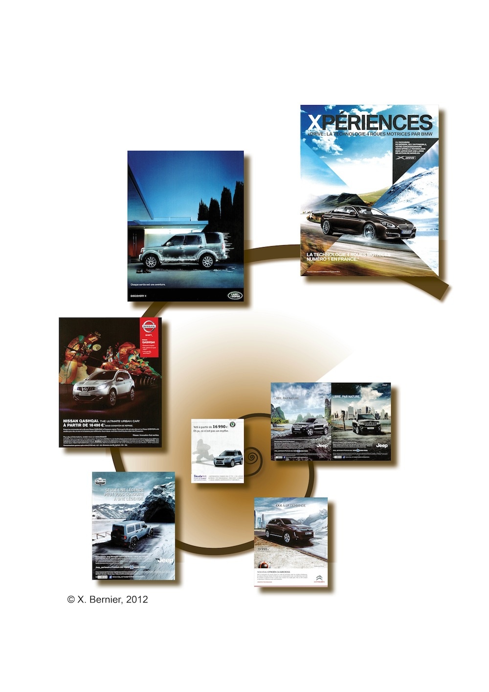 La publicité pour BMW est sans doute celle qui exprime le mieux les dimensions du traverser et celle qui illustre de la façon la plus forte la cristallisation du traverser dans l’image. Son titre suggère une succession d’« expériences » tandis que les quatre facettes de l’image disent les quatre saisons (tous les rythmes), mais aussi tous les espaces. Le véhicule tout terrain est celui du tout espace en quelque sorte. L’image condense ici toutes les traversées en ce qu’elle dit le traverser. D’un point de vue sémiotique et symbolique, le signe X des 4X4 (« Xdrive ») est le point de convergence d’une mise en tension spatiale qui se fait à partir de l’individu social ou du groupe social. L’éclatement puis la recomposition des unités d’espace en morphologies spatio-temporelles sont aussi des arrangements dans la sémiosphère. Ils participent pleinement de la mise en relation qu’est le traverser. La langue et les mots utilisés pour désigner certains véhicules sont édifiants, avec, par exemple, la figure à succès du Crossover.
