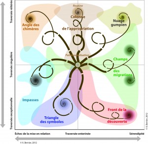 L’ensemble construit bien un espace bi-dimensionnel dont la croix est le point de convergence. En référence au « diathigè » démocritéen, nous proposons d’appeler diatigisation ce processus de mise en relation, soit les interspatialités dans lesquelles se coordonnent les espaces du traverser. Les espaces s’organisent de proche en proche à partir de l’individu ou du groupe social et la traversée se réalise dans une proximité. Nous soutenons ainsi l’idée selon laquelle il n’y a de traversée que locale. Nous sommes bien ici dans un espace non euclidien, dans lequel le local n’est pas ce que l’on peut croire dans un plan de base. Tout amène alors à interroger la « distance ».