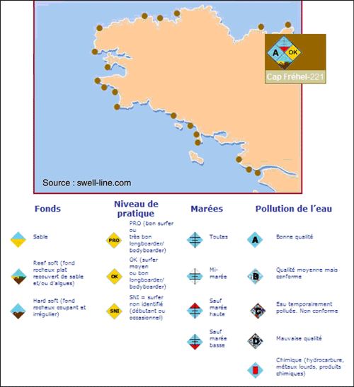 La variabilité spatiale de la nature des spots est propice à la production cartographique. En tête de cet article, un document de ce type a été extrait d’un site Web spécialisé. On y retrouve une sémiologie graphique assez inventive. L’information dont a besoin le surfeur est regroupée dans un seul cartouche (losange), propre à chaque site. La légende de la carte décrit à la fois la géographie physique du spot (nature du fond, relation avec la marée) et les éléments de nature anthropique qui peuvent influer sur la pratique du sport (niveau de surf requis, qualité de l’eau). En raison de sa proximité géographique, l’exemple du Cap Fréhel (Côtes d’Armor) a été choisi pour illustrer la manière dont se consulte cette « carte » : le fond y est à la fois rocheux et sableux ; il faut avoir déjà pratiqué pour s’y rendre ; il n’y a pas de vagues à marée basse ; l’eau y est d’une excellente qualité.