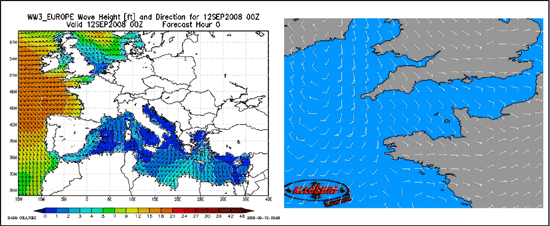 Malgré la richesse de l’information qui peut en être tirée, à lui seul, ce document ne suffit pas aux surfeurs. Pour compléter l’analyse et anticiper leurs déplacements, les amateurs de glisse se tournent vers les cartes où sont retranscrites les données issues des modèles numériques de simulation des conditions météo-marines. Plusieurs paramètres essentiels leur incombent : d’une part les caractéristiques de la houle et, d’autre part, les conditions atmosphériques locales, en particulier en ce qui concerne le vent. Afin de visualiser la propagation d’un train de houle, une échelle de couleur est souvent utilisée pour représenter, par tranche (en mètres ou en pieds selon les sources), la hauteur des vagues à un endroit donné. Il est ainsi relativement aisé de connaître l’heure exacte de son arrivée et, selon les lois physiques propres à ce domaine, telle celle de la propagation des ondes (Bonnefille, 1992), avec quelle amplitude ce train de vagues pourra aborder la côte.